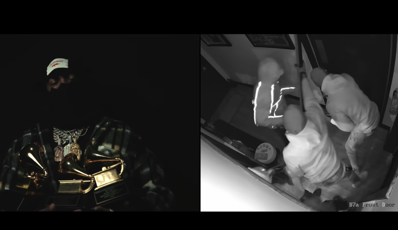 “This morning around 4 am some idiots broke into my office / studio and went thru a hassle just to get next to nothing. i had my grammys there and i know they wanted my jewels but not today champions FOH. i did a freestyle called “Crow Bars” watching the footage of these low life’s going thru my shit smh. If you know these clowns tag em in the comments i got cash for you.”